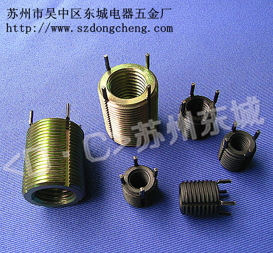 插销螺套简介: 插销螺套(有的厂商称为键销型螺纹衬套)是内外具有标准螺纹,外螺纹上有两根或四根插销的螺套。用来增强螺纹孔的紧固强度与安全性能,或用于修复螺纹孔。 东城电器五金厂是国内首先试制和批量供应插销螺套的单位之一,产品生产历史悠久、质量可靠、价廉物美。十余年来,插销螺套广泛用于机载、舰船、车载的军用电子装备和仪器仪表、机车等产品中,经受了严酷的振动、冲击、盐雾、湿热等试验和实际使用考验。
